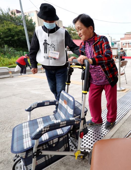 보행기 끌고 소중한 한 표 - 재·보궐선거일인 16일 인천 강화군 강화읍 제2투표소에서 한 주민이 보행기를 끌고 투표소를 떠나고 있다. [연합뉴스] |