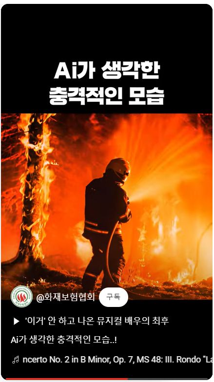 한국화재보험협회는 최근 AI를 활용해 숏폼(짧은 영상) 형태의 화재예방 콘텐츠를 잇따라 게재하고 있다. AI 기술로 일상생활 속 재미있는 상황을 연출하고 젊은 세대가 공감할 수 있는 유머 코드도 가미했다. 현재까지 '뮤지컬 배우의 최후' 등 9편을 제작했고 유튜브 등 합산 조회 수는 27만회가 넘는다. 김동규 한국화재보험협회 경영지원본부장은 "전통시장·주택·산림 등 주로 화재 취약 대상을 소재로 다뤘다"며 "AI로 화재예방이라는 다소 무거운 주제를 흥미롭게 풀어낼 수 있었다"고 전했다.