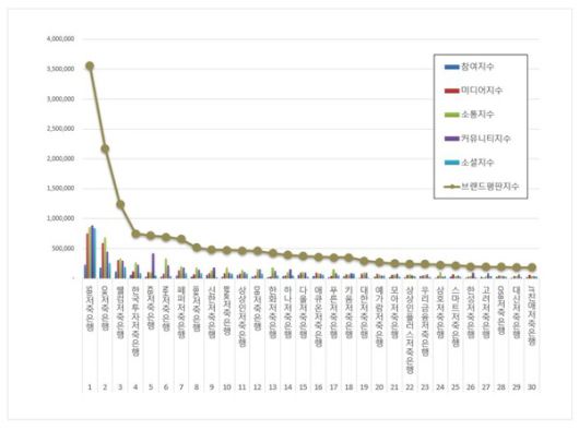 5위, KB저축은행 브랜드는 참여지수 32,598 미디어지수 110,506 소통지수 104,708 커뮤니티지수 422,533 소셜지수 45,414가 되면서 브랜드평판지수 715,759로 분석됐다. 지난 9월 브랜드평판지수 464,269와 비교해보면 54.17% 상승했다.