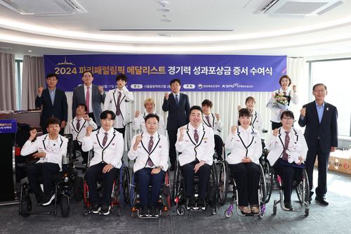 (서울=연합뉴스) 김동찬 기자 = 국민체육진흥공단은 2024 파리 패럴림픽에서 메달을 획득한 선수와 지도자에게 경기력 성과포상금 증서를 수여했다고 17일 밝혔다.