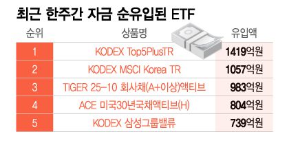 17일 코스콤 ETF체크에 따르면 최근 한주동안 투자자들이 가장 많이 사들인 상품은 'KODEX Top5PlusTR' ETF로 1419억원이 몰렸다. 'KODEX MSCI Korea TR'(1057억원), 'TIGER 25-10 회사채(A+이상)액티브'(983억원), 'ACE 미국30년국채액티브(H)'(804억원), 'KODEX 삼성그룹밸류'(739억원) ETF 등이 뒤를 이었다. 이 기간 순유입 상위 10위권 안에서 레버리지나 인버스 상품을 찾아볼 수 없었다.