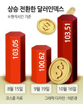 ▶원달러 환율 1370원 돌파=18일 금융정보업체 코스콤에 따르면, 주요 6개국 통화 대비 미국 달러화 가치를 나타내는 달러인덱스는 지난 17일(현지시간) 103.51를 기록하며 지난 8월 중순(103.05) 수준까지 올랐다. 연준이 금리를 0.5%포인트 인하한 지난달 18일 전후로는 100선까지 내렸다가 이달 상승세로 방향을 틀었다.