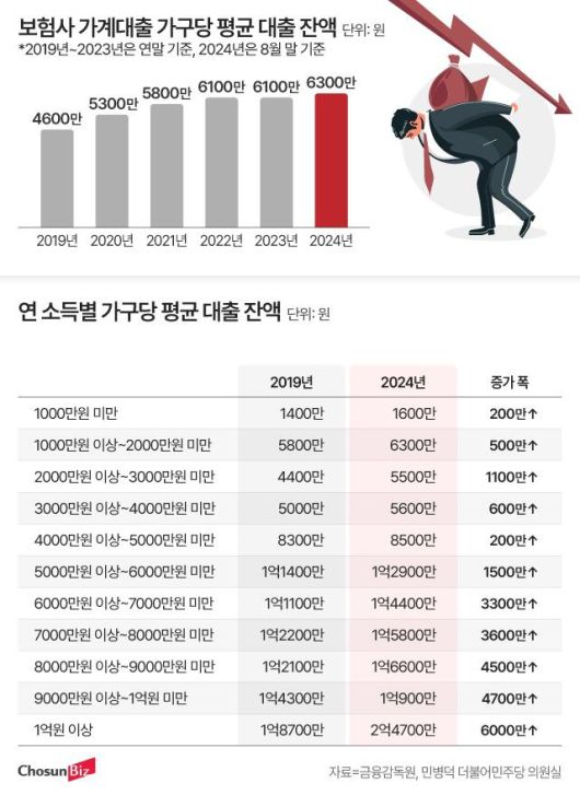 지난 5년 동안의 자료를 비교해 보면 보험사 차주(돈 빌리는 사람)의 소득이 높을수록 가계대출 증가 폭도 커지는 경향을 보였다. 연 소득 1000만원 미만 가구의 평균 가계대출 잔액은 2019년 1400만원에서 올해 8월 1600만원으로 200만원 증가했다. 반면 같은 기간 연 소득 1억원 이상 가구의 평균 대출 잔액은 1억8700만원에서 2억4700만원으로 6000만원 불어났다.