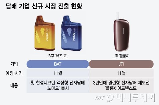 글로벌 담배기업 BAT(브리티시아메리칸토바코)의 한국법인 BAT로스만스가 다음달 합성니코틴을 사용하는 액상형 전자담배를 출시한다. 대형 담배회사가 합성니코틴 담배를 파는 것은 전세계에서 이번이 처음이다. 이와 별도로 그동안 국내에서 궐련담배만 판매해온 JTI(재팬 타바코 인터내셔널)의 한국법인 JTI코리아가 다음달 궐련형 전자담배 시장에 진출한다. KT&G와 필립모리스 인터내셔널(PMI)이 양분해온 전자담배시장에 균열을 낼지 주목된다.