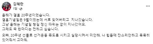 앞서 김혜란 대변인은 전날 페이스북에 자신의 결혼 20주년을 기념하는 글을 올렸다. 김 대변인은 이 게시글에서 배우자를 '오빠'로 지칭하며, 괄호로 '이때 오빠는 우리 집에서 20년째 뒹굴거리는 배 나온 오빠'라고 적었다.