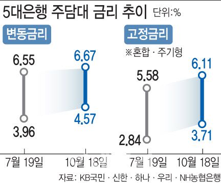 고정금리 역시 올 하반기 들어 꾸준한 상승세를 기록하고 있다. 5대 은행의 고정금리(혼합형·주기형)는 연 3.71~6.11%로 지난 7월 19일(연 2.84~5.58%)과 비교하면 금리 하단과 상단이 각각 0.87%포인트, 0.53%포인트 높아졌다.