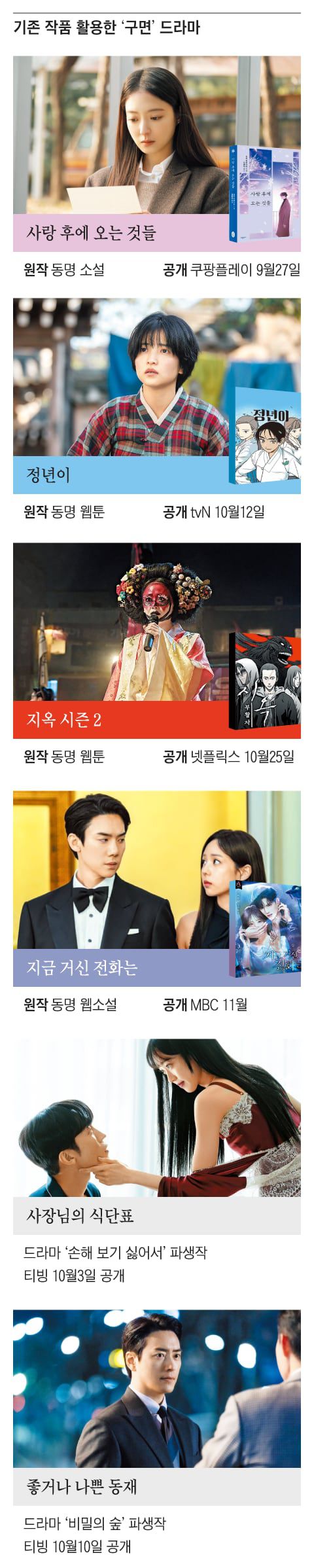 TV에선 웹소설·웹툰 원작 드라마가, OTT에선 스핀오프(파생작)·시즌제 드라마가 크게 늘어나는 추세다. 높아진 제작비 등으로 드라마 편성 자체가 줄어든 지상파 방송은 검증된 원작이 있는 드라마로 위험 부담을 낮추고 있다. 올해 웹툰을 원작으로 한 ‘완벽한 가족’과 ‘함부로 대해줘’가 KBS에서 방영됐고, MBC는 웹소설 원작의 ‘지금 거신 전화는’(11월 방영)과 웹툰 원작 ‘바니와 오빠들’(내년 상반기) 방영을 앞두고 있다. SBS도 웹툰 원작 ‘모범택시’의 시즌 3 제작을 결정했다. 케이블 채널 tvN은 ‘내 남편과 결혼해줘’ ‘선재 업고 튀어’ 등 웹소설 원작 작품에 이어, 웹툰 원작 ‘정년이’를 방영 중이다. OTT에서도 소설 원작 작품 ‘사랑 후에 오는 것들’(쿠팡플레이)과, 기존 드라마의 파생작인 ‘좋거나 나쁜 동재’와 ‘사장님의 식단표’(티빙), 기존의 세계관을 잇는 시즌제 드라마가 주를 이루며 ‘초면’인 작품이 드물 정도다.