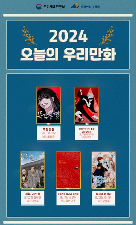 한국만화가협회와 문화체육관광부는 21일 '2024 오늘의 우리만화' 수상작으로 '똑 닮은 딸', '부르다가 내가 죽을 여자뮤지션', '세화, 가는 길', '헤매기의 피곤과 즐거움', '황제와 여기사' 등 5편을 선정했다.