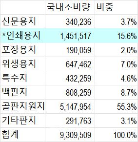 2023년 국내 제지 소비량 . (단위= t, 자료= 한국제지연합회) |