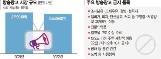 방송사업자들은 다른 법령에서 제한하는 품목도 방송 광고를 할 수 없다. 식품 규제가 대표적이다. '어린이 식생활 안전 관리 특별법'이 발목을 잡는다. 햄버거, 피자, 아이스크림, 커피, 과자 등 고열량·저영양 및 고카페인 식품은 오후 5시부터 7시까지 방송 광고를 할 수 없다. 고열량·저영양 식품 기준은 식사대용일 경우 1회 섭취참고량당 열량 500㎉를 초과하고, 단백질 9g 미만이거나 나트륨 600㎎을 초과하는 식품 등은 금지된다. 간식용은 1회 섭취참고량당 열량 250㎉를 초과하고 단백질 2g 미만인 식품 등이 금지 대상이다.