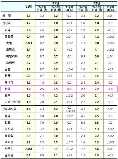 한국의 올해 2.5% 경제성장률 전망은 지난 7월 전망을 유지하는 수치다. 당시 정부는 2.6%, 한국은행은 2.4%, 한국개발연구원은 2.5%로 전망했고, 경제협력개발기구(OECD) 역시 2.5%로 내다봤다.