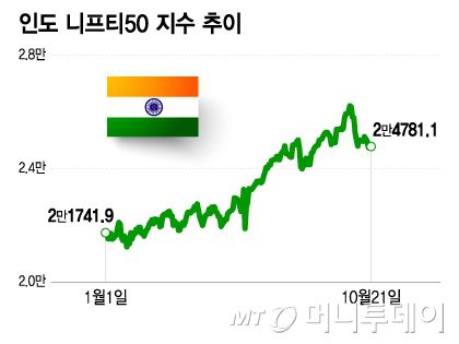 22일 오후 3시30분 기준 인도 대표 주가지수 중 하나인 니프티50 지수는 전일 대비 109.8포인트(0.44%) 하락한 2만4671.3을 나타냈다. 지난달 26일 2만6216.05를 기록하며 신고가 행진을 이어갔지만 그 다음날부터 조정이 시작됐다. 현재는 고점 대비 약 5% 하락한 상태다. 또 다른 인도 대표지수인 센섹스 지수 역시 현재 8만758.5를 나타내며 지난달 26일 고점 대비 약 5% 내려갔다.