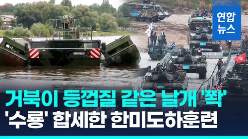 한미장병 1천여 명이 참여한 이날 훈련에서는 수룡 6대가 뗏목 형태로 바뀌어 K1A2 전차와 K200 장갑차 등을 강 건너편으로 실어 날랐습니다.