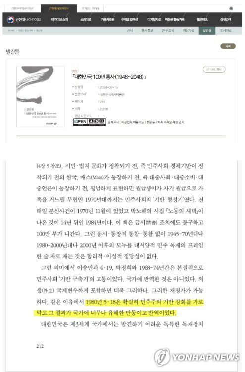 지난 7월 대한민국역사박물관이 발행한 '대한민국 100년 통사'에는 '1980년 5·18은 확실히 민주주의 기반 강화를 가로막고 그 결과가 국가에 너무나 유해한 반동이고 반역이었다'는 내용이 담겼다.