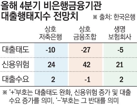 문제는 이마저도 어려워질 것이란 전망이 나오고 있다는 점이다. 이날 한국은행이 발표한 ‘금융기관 대출행태서베이 결과’에 따르면 올해 4분기 국내은행의 대출태도지수는 마이너스(-) 12로 예측됐다. 비은행 금융기관의 4분기 대출태도지수도 상호저축은행(-10), 상호금융조합(-27), 생명보험회사(-5) 등이 강화될 것으로 예상됐다.