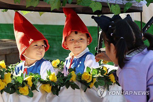 (곡성=연합뉴스) 조남수 기자 = 24일 전남 곡성 섬진강기차마을에서 열린 심청어린이대축제에서 한 아이가 개막 퍼레이드에 참여한 동생과 이야기를 나누고 있다. 2024.10.24