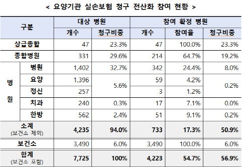 25일 금융위원회에 따르면 이날부터 병원급 의료기관과 보건소를 대상으로 ‘실손보험 청구 전산화’가 시행된다. 일단 이날 210개 병원부터 순차적으로 청구 전산화를 시행한다. 금융위의 ‘요양기관 실손보험 청구 전산화 참여 현황’에 따르면 지난 24일 기준 병상 30개 이상 병원 4235개 중 청구 전산화를 시행하는 곳은 733곳(17.3%)이다. 상급종합병원과 종합병원의 참여 비율은 각각 100%, 64.7%지만, 규모가 작은 편인 병원 3857곳의 참여 비율은 12%(472곳)에 그친다.