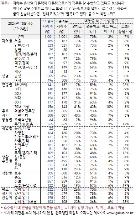 25일 한국갤럽이 발표한 여론조사 결과(22~24일 전국 만 18세 이상 1001명 대상, 95% 신뢰수준에 표본오차 ±3.1%포인트)에 따르면, 윤 대통령 직무수행에 대한 긍정평가는 지난주보다 2%포인트 하락한 20%를 기록했다. 부정평가는 1%포인트 상승한 70%로 집계됐다. 이는 지난 9월 2주차 조사에서 정부 출범 이후 최저치(20%)를 기록한 뒤 소폭 반등하던 기세가 다시 꺾인 것이다.