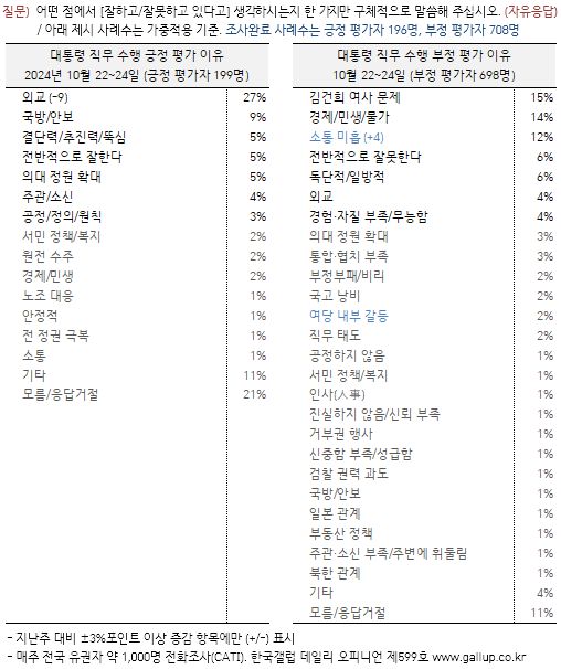 한 여론 전문가는 통화에서 “9월은 추석을 앞두고 의료대란 위기가 고조되던 시기였다”며 “이번엔 그 고비를 넘겼으나 여사 문제와 한 대표와 갈등이 주요 하락 원인으로 작용한 것으로 분석된다”고 말했다.