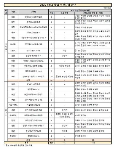 (서울=연합뉴스) 이영호 기자 = 한국프로축구연맹이 프로축구 23개 구단(K리그1 12개·K리그2 11개)의 우선 지명선수 157명의 명단을 25일 발표했다. 이 중 15명은 준프로 계약을 맺고 프로에 직행한다.