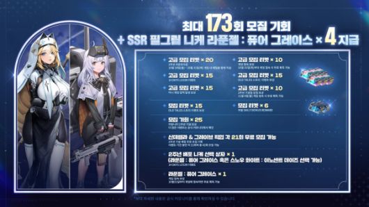 2주년을 기념해 최대 173회 모집 기회와 SSR 필그림 니케 라푼젤: 퓨어 그레이스를 지급한다.
