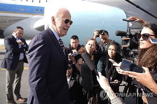 펜실베이니아주 공항서 기자들 질문에 답하는 바이든 |