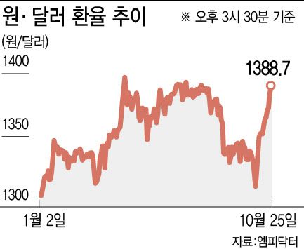 지난 9월 말 환율은 장중 1303.4원까지 내려갔다. 하지만 10월 들어 환율은 단 이틀을 제외하고 연일 상승하며 1390원대까지 급등했다. 한 달도 채 되지 않아 100원 가까이 오른 셈이다.