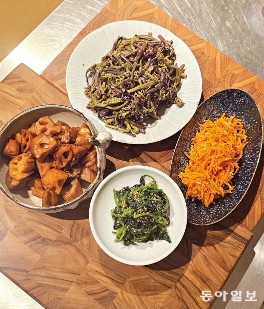 “100% 국내산 식재료를 사용합니다. 재료, 조리법, 양념 베이스를 겹치지 않게 해요.간장 조림이 있으면 소금 간을 한 볶음 요리, 깨 소스나 두부로 무친 무침 요리를 곁들이죠. 그러면 식감도 겹치지 않거든요. 가능한 색상도 겹치지 않으려고 합니다.”