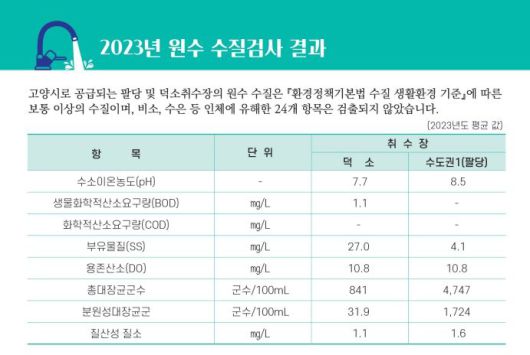 한편, 매월 정기적으로 실시하는 수질 검사 결과와 매년 발간되는 수돗물품질보고서는 고양시 상하수도사업소 누리집에서 확인할 수 있다. 특히 수돗물품질보고서에는 수돗물 근원지인 원수 수질 검사 결과부터 수돗물 생산·관리 과정, 상수도 공급 현황 등 안전한 수돗물 사용에 대한 생활 정보가 담겨있다.