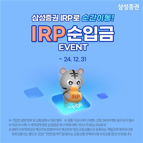 (서울=연합뉴스) 송은경 기자 = 삼성증권[016360]은 28일 개인형 퇴직연금(IRP) 순입금 이벤트를 올해 연말까지 진행한다고 밝혔다.