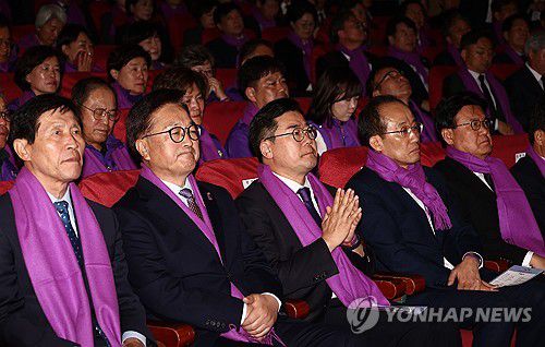 여야 지도부를 비롯해 보라색 목도리를 두른 참석자들은 희생자들의 영정에 분향·헌화했다.