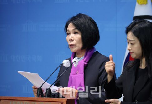 최민희 국회 과방위원장(더불어민주당 의원)이 29일 서울 여의도 국회 소통관에서 추경호 국민의힘 원내대표 국회 윤리위원회 제소 기자회견을 하고 있다. (사진=뉴시스) |