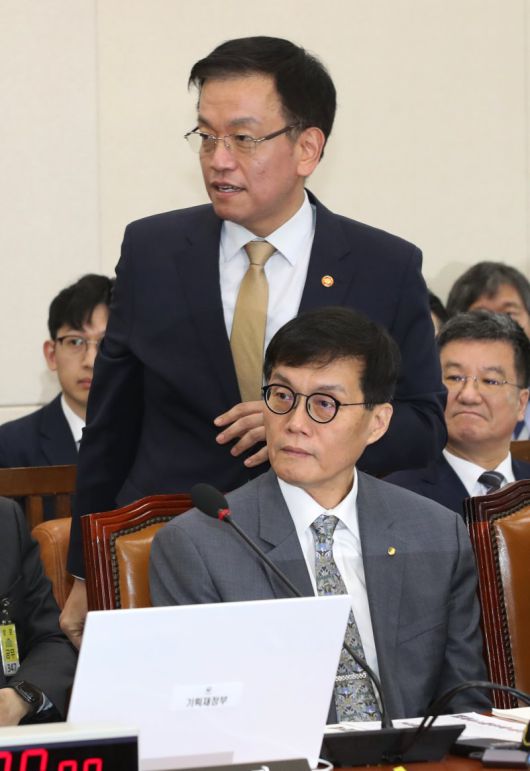 (서울=뉴스1) 이광호 기자 = 최상목 경제부총리 겸 기획재정부장관과 이창용 한국은행 총재가 29일 오전 서울 여의도 국회에서 열린 기획재정위원회의 기획재정부, 한국은행 등에 대한 종합 국정감사에 출석해 있다. 2024.10.29/뉴스1 /사진=뉴스1화상 |