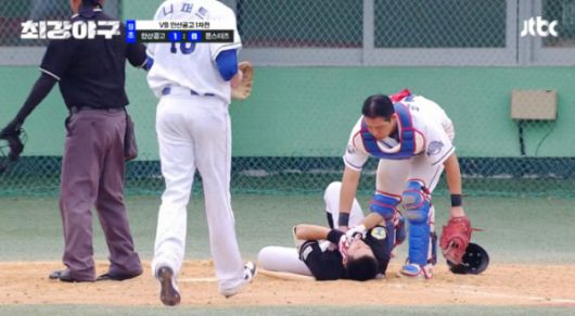 지난 28일 방송된 '최강야구' 최강 몬스터즈와 안산공고의 경기에서 김경민은 9회 초 대타로 나와 니퍼트가 던진 공에 턱을 맞고 쓰러졌다.