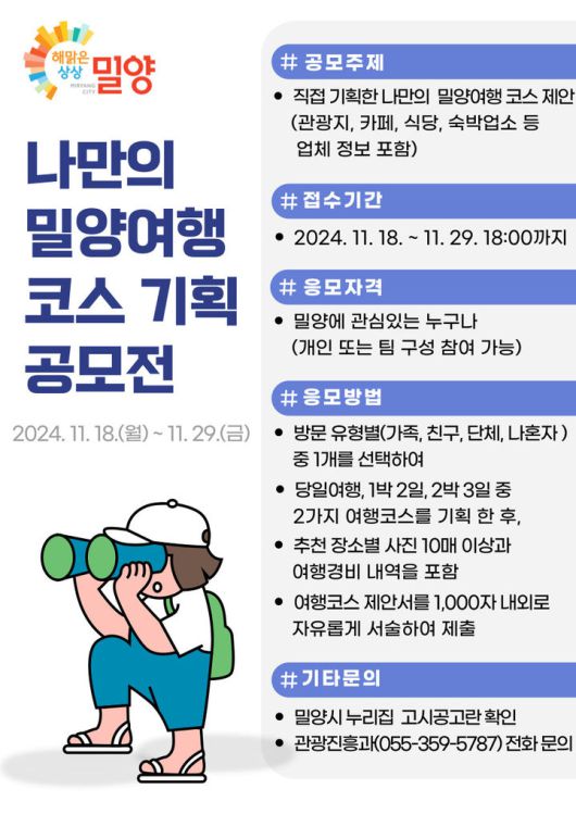이 공모전은 밀양의 주요 관광지, 카페, 식당, 숙박업소 등을 포함한 개인적인 여행 코스를 개발하기 위해 마련됐으며, 밀양의 숨겨진 관광자원을 발견하고 새로운 여행 코스를 만들어 관광객 유치와 지역 경제 활성화에 기여할 것으로 기대된다.