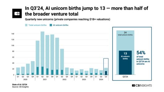 또한, 3분기 동안 새롭게 탄생한 AI 유니콘 스타트업은 전 분기 대비 두 배 이상 증가한 13개로, 벤처 시장 전체 유니콘 중 54%를 차지했다. 이 중 생성형 AI 분야의 스타트업들이 절반 이상을 차지했으며, 월드랩스(World Labs)의 3D 환경 AI, 코드 생성 플랫폼 코드리움(Codeium), 법률 워크플로우 자동화 도구 하비(Harvey) 등이 주요 유니콘으로 등장했다. 특히 OpenAI 공동 창립자 일리야 수츠케버가 공동 창업한 세이프 슈퍼인텔리전스(Safe Superintelligence)는 9월 10억 달러 시리즈 A 투자로 50억 달러의 높은 가치를 인정받았다.