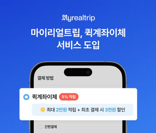 간편 결제 서비스 확대를 기념해 마이리얼트립은 이달 말까지 결제 고객들에게 마이리얼트립 5%(최대 15만 포인트) 포인트 적립과 생애 최초로 퀵계좌이체 수단을 등록 결제한 고객들을 대상으로 추가 3000원 즉시 할인 혜택을 제공하는 프로모션을 실시한다.