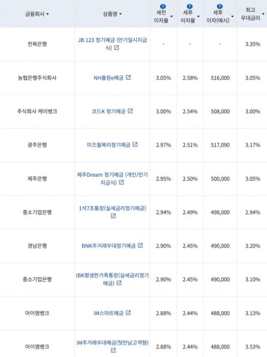 3일 금융감독원 금융상품통합비교공시에 따르면 은행 24개월 정기예금 가운데 세전 이자율 기준 기본 금리가 가장 높은 상품은 농협은행 ‘NH올원e예금’으로 연 3.05%의 금리를 제공한다.