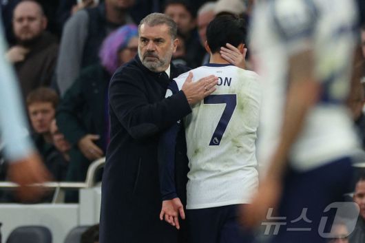 이른 교체에 아쉬워하는 손흥민을 위로하는 엔제 포스티코글루 감독ⓒ AFP=뉴스1 |