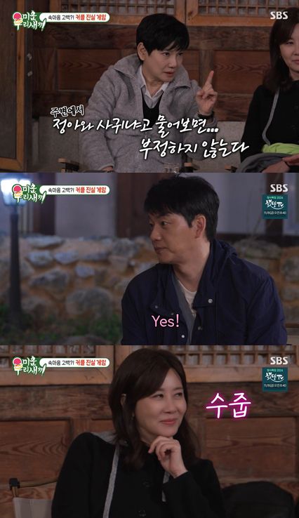 이후 네 사람은 진실게임을 진행했다. 김승수가 걸렸고, 안문숙은 주변에서 양정아와 사귀냐고 물어보면 부정하지 않은지에 대해 물었다. 김승수는 "부정하지 않는다"라고 답하며 양정아를 깜짝 놀라게 했다.