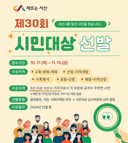 (서산=연합뉴스) 충남 서산시는 제30회 시민대상 후보자 추천을 오는 15일까지 읍·면·동 행정복지센터를 통해 받는다고 4일 밝혔다.