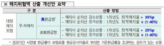 무저해지 상품은 계약자가 덜 해지할 수록 보험사가 지급해야 할 보험금이 많아진다. 대량해지 충격이 40% 가량 낮아지면 지금보다 요구자본량이 늘어나 보험사의 자본비율이 더 하락한다. 40% 하락 충격은 캐나다 사례를 참고 했다. 금융당국은 보험업감독업무 시행세칙을 개정해 12월말 킥스에 적용할 계획이다.