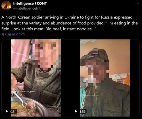 그는 "러시아를 위해 싸우러 우크라이나에 도착한 북한군 병사가 제공된 음식의 다양함과 푸짐함에 놀라고 있다. 그는 '난 전장에서 먹고 있다. 이 고기를 봐라. 큰 소고기와 즉석라면이다'라고 말한다"고 적었다.
