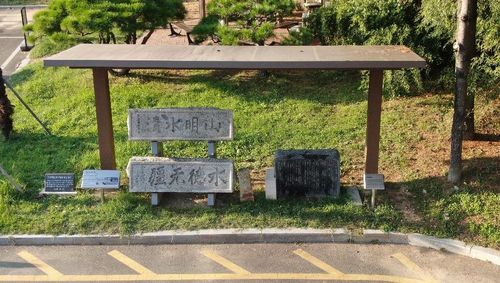 두 개의 석물에는 일제강점기 조선 총독으로 부임한 사이토 마코토와 당시 마산 부윤(시장)을 지낸 판원지이(板垣只二)의 글씨 '산명수청'(山明水淸·산수가 맑고 깨끗해 경치가 좋음)과 '수덕무강'(水德无疆·물의 덕은 커서 끝이 없음)이 각각 적혀 있다.