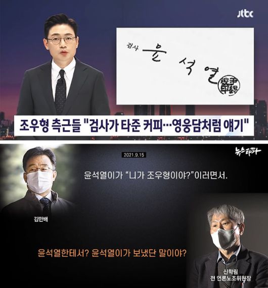 JTBC가 2022년 2월 28일 대출 브로커 조우형씨 측근들이 ‘조씨가 부산저축은행 사건으로 조사받을 당시 중수2과장이었던 윤석열 대통령과 커피를 마셨다고 말했다’는 취지로 보도하는 장면(위 사진). JTBC는 같은 달 21일에 이어 같은 내용을 반복해 보도했다. 뉴스타파는 그해 3월 6일 ‘윤 대통령이 검사 시절 자신의 사무실에서 조우형씨를 만났고 조씨 수사를 무마했다’는 취지의 내용이 담긴 김만배씨 녹음 파일을 보도했다. 이들 보도는 ‘가짜 뉴스’로 드러났다. /JTBC·뉴스타파 |
