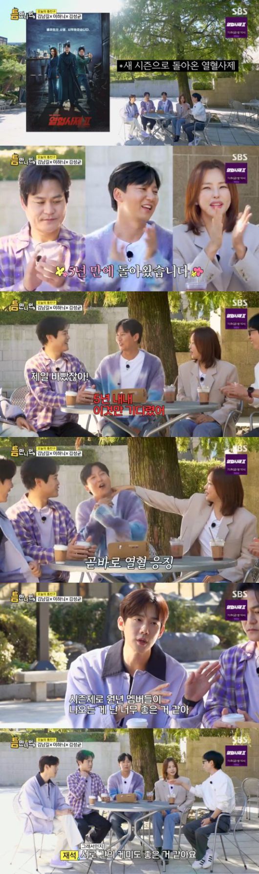 지난 5일 방송된 SBS 예능 프로그램 '틈만나면'에서는 '열혈사제2'의 김남길, 이하늬, 김성균이 '틈 친구'로 출연해 유재석, 유연석과 함께 '틈 주인'을 만나 이야기를 나눴다.