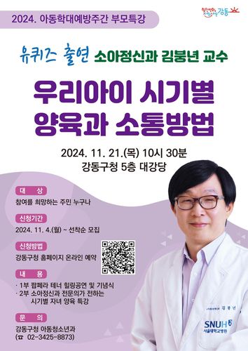 (서울=연합뉴스) 정수연 기자 = 서울 강동구(구청장 이수희)는 오는 21일 구청 대강당에서 김붕년 서울대학교 어린이병원 소아청소년 정신과 교수를 초청해 특강을 한다고 6일 밝혔다.