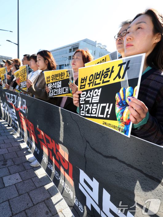 (서울=뉴스1) 황기선 기자 = 전국교직원노동조합과 교육시민사회단체가 6일 오전 서울 용산구 대통령실 앞에서 전교조 수사의뢰한 윤석열 정부 규탄 기자회견을 하고 있다. 2024.11.6/뉴스1juanito@news1.krCopyright ⓒ 뉴스1. All rights reserved. 무단 전재 및 재배포, AI학습 이용 금지.