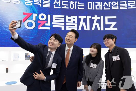 (서울=뉴스1) 송원영 기자 = 윤석열 대통령이 6일 강원도 춘천 송암스포츠타운 일대에서 열린 '2024 대한민국 지방시대 엑스포' 행사장에서 강원특별자치도관 관람 뒤 청년 대표들과 기념촬영을 하고 있다. (대통령실 제공) 2024.11.6/뉴스1sowon@news1.krCopyright ⓒ 뉴스1. All rights reserved. 무단 전재 및 재배포, AI학습 이용 금지.