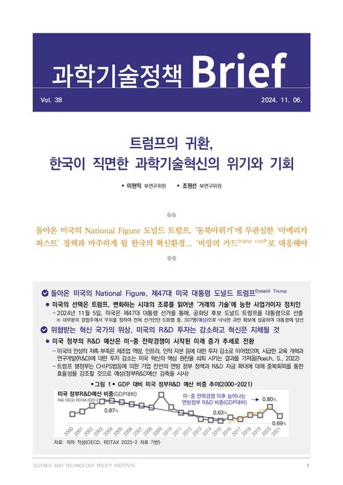 과학기술정책연구원(STEPI, 원장 윤지웅)은 도널드 트럼프 행정부 2기로 인해 한국이 마주하게 된 과학기술혁신 위기·기회를 조망한 '과학기술정책 브리프' 38호를 발간했다.